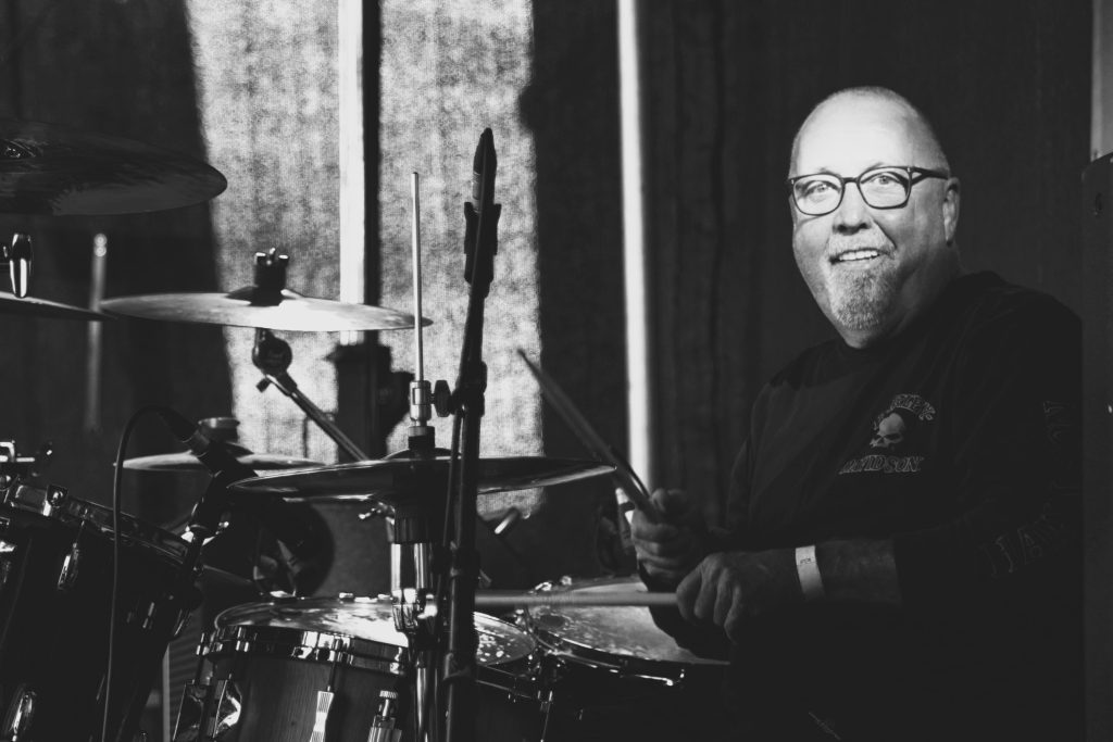 Jürgen Sonnenschein an speziell gefertigten Holzkataster-Trommeln, ehedem ein Einbauschrank, jetzt kleingeklöppelt auf Sonorstockgröße, achso: und mindestens ein Bier pro Probe